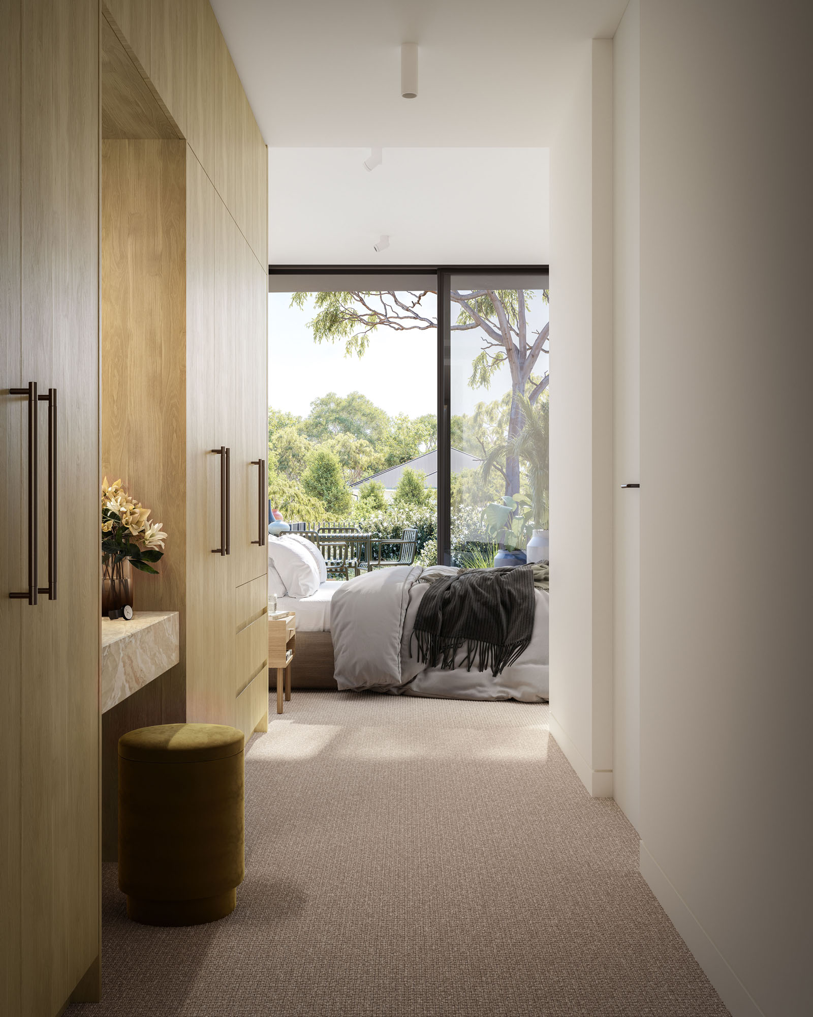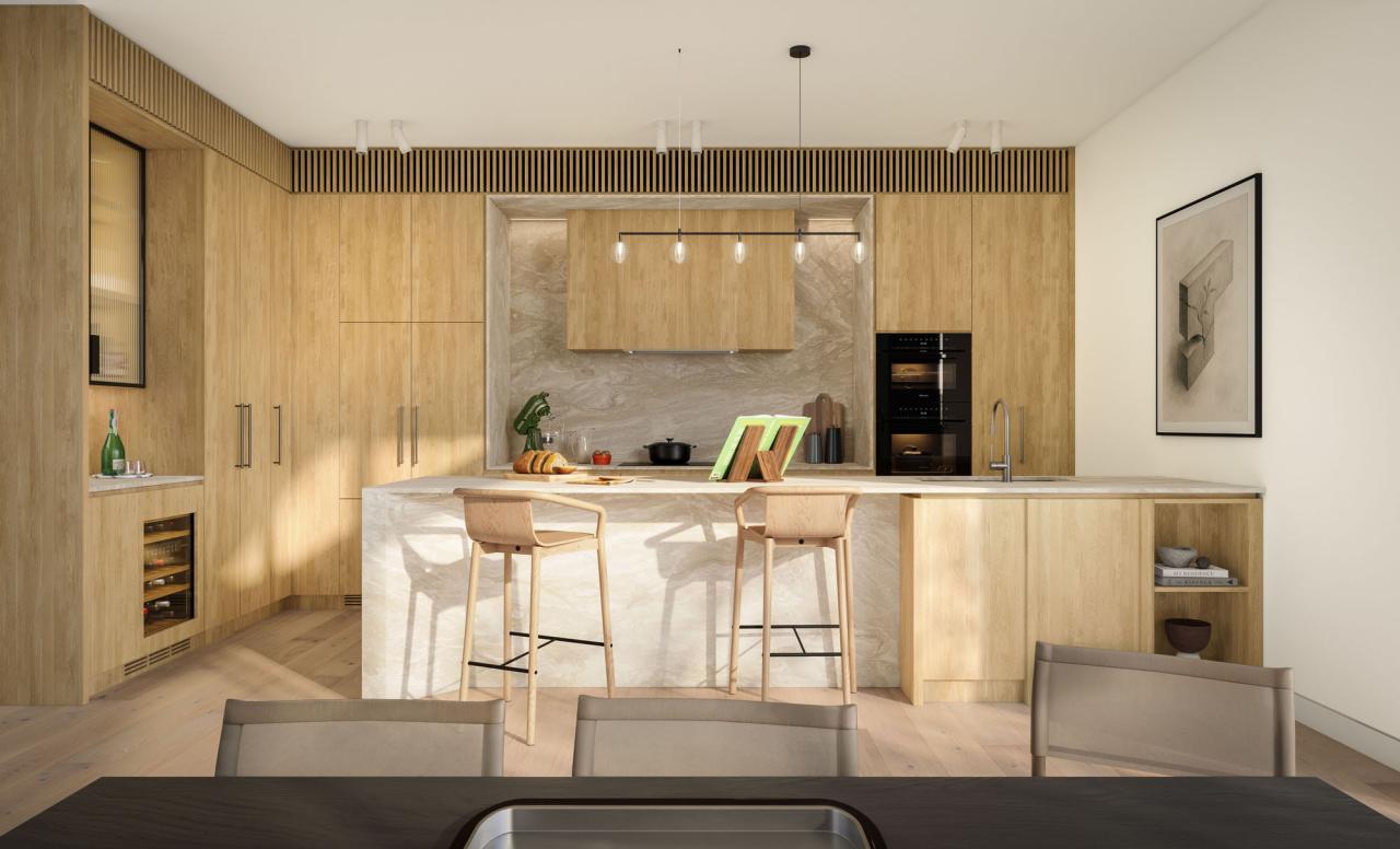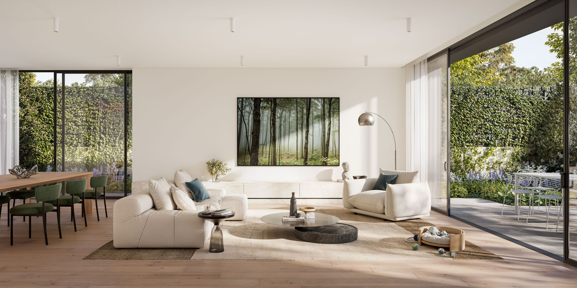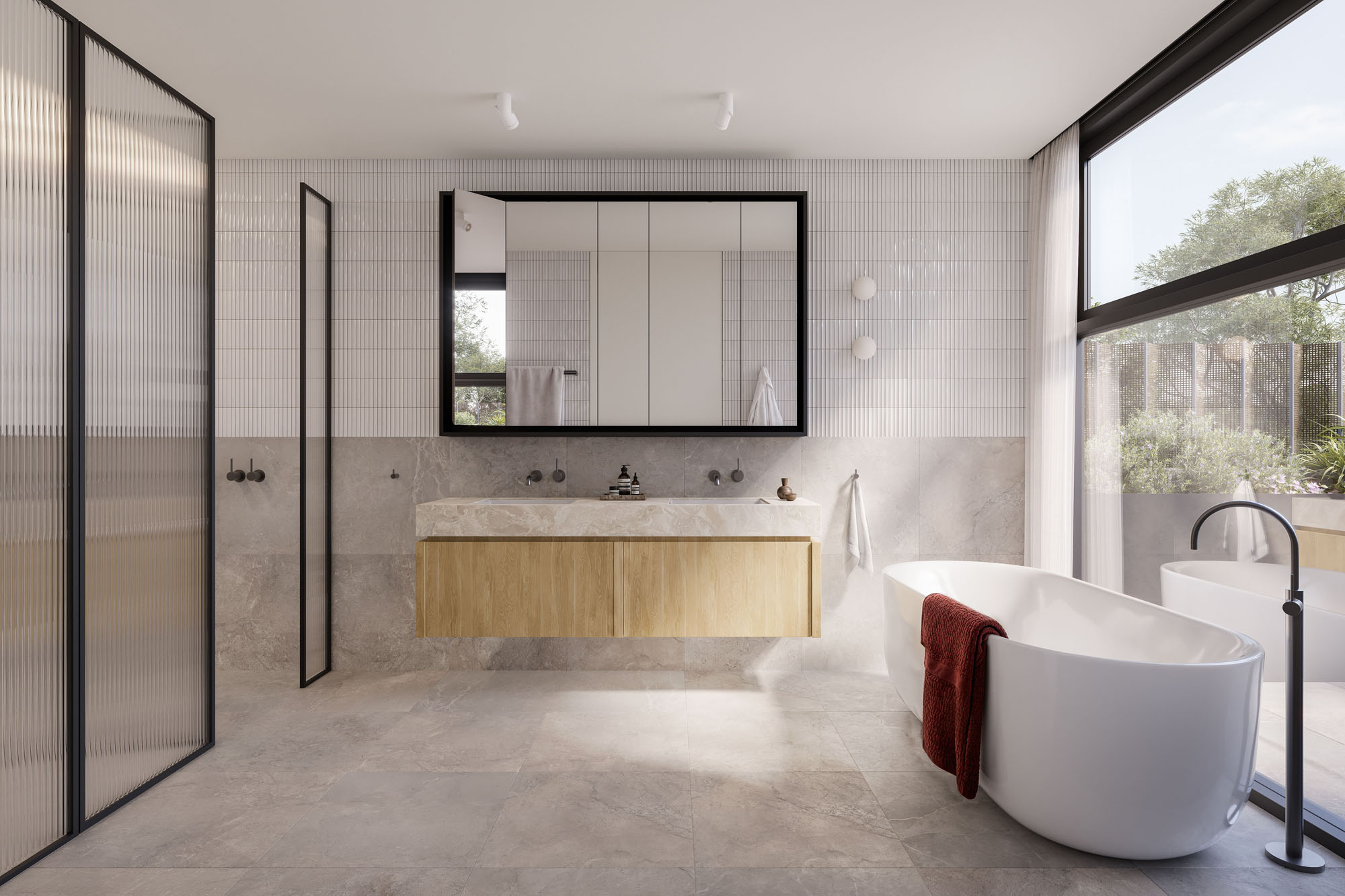 A refined, restrained interior palette of natural materials – metal, stone, and timber – imbues the spaces with a sense of enduring quality and sophistication, reflecting the grandeur of the surrounding suburb. Rich timber floors, natural stone, and metal detailing create a tactile, warm atmosphere. Each residence is designed to offer a harmonious balance of beauty, functionality, and durability, providing a space that is both effortlessly luxurious and built to stand the test of time.